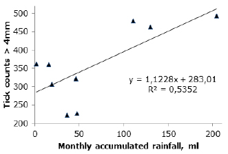 Relationship between some abiotic factors and parasite load of R. (B.) microplus. At Hacienda La Isabela, there was a positive correlation between cumulative monthly rainfall and tick counts (R2=0.53; Figure 3).