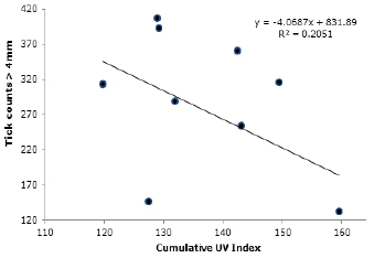 Data Analysis. Tick loads of different groups were analyzed by analysis of variance following a completely randomized design. Duncan’s test was used for separation of the production groups means. Additionally, correlation analyses between animal tick load data and climatic variables were performed, including those with the UV index and saturation deficit calculated before tick counts.