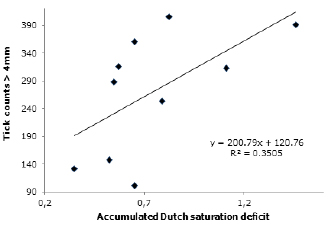 The saturation deficit is a value frequently used in modeling the population dynamics of tick populations both to assess climate change, and to simulate the effect of rotational grazing (24, 25). From these exercises it is concluded that there is a strong relationship between mortality of larvae and eggs and saturation deficit (25). It is important to note that, after a retrospective study that took weather information from different European countries, it was concluded that there was no relationship between cumulative rain with relative humidity and saturation deficit (26). Thus, it is not appropriate to take precipitation as the only explanatory variable for tick population dynamics (26).