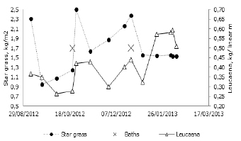 Relationship between forage supply and the frequency of acaricide baths. Figure 6 shows the availability of biomass as determined by the appraisals made in ISS for eight months. Biomass availability is shown separately for leucaena and star grass, as well as the number of acaricide baths that were carried out in the same period. At Hacienda Lucerna, the decision is to carry out the minimum possible of acaricide baths. The parasite load decreased 74.5% by the end of October and 38.8% after the bath made in December.