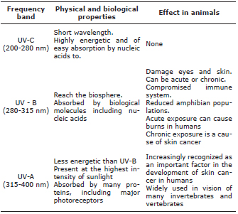 Another of the abiotic factors studied was radiation, which has an important effect on young organisms. Langrová et al (27) conducted a study to assess the influence of the drying effects of UV radiation in intestinal parasites in horses exposed to the sun for several days. The results were 2.5% death of larvae 3 (infective) after 17 days of exposure (27). Similar work was carried out with Tetranychus urticae, but this time aiming to assess the effect of exposure to UV rays. Brief UV exposure periods lead to larvae death and unviable eggs (28). Navas-Panadero (14) evaluated the photosynthetically active radiation and its effect on the number of larvae of ticks found in pastures with different silvopastoral arrangements and found no difference between the silvopastoral and more conventional arrangements. It is important to recognize that UV rays are not a single homogeneous variable, but have different effects according to wavelength (Table 2).