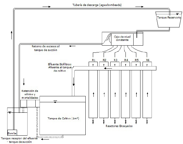 Components and operation of the recirculation system. The RAS consisted of a fiberglass culture tank − CT − 0.991 m3, 1.28 m diameter and a height of 0.87 m. The tank had a central drain, external overflow in 1-1/2” PVC piping coupled to a level control with two perforated plates for retention of solids. The effluent passed through a canvas bag filter, the filtered liquid accumulated in a 100 L suction tank that a 1 HP pump sent to a reservoir and then to a constant level box with 0.20m hydraulic loading that distributed the water by gravity to the 6 upflow biofilters (reactors) witha a ½” transparent hose. The reactors were made with 3” PVC sanitary pipe and a total height of 1.0 m. The influent entered the biofilters through an acrylic base perforated with 115 3.57 mm holes and the flow rate was controlled with ball-type valves. The treated effluent left laterally through ½” flexible tubes and hosing located 0.95 m from the base and was collected in a PVC channel that returned it to the CT.