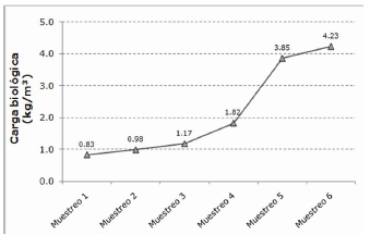 Periodic weight increase and feed conversion. The initial biomass loading was 0.83 kg/m3 and at the end 4.23 kg/m3. An average daily of individual weight increase during the test was 1.58 g/d and an average FC value of 1.41. Figure 3 shows the values of the CT bioburden during the experiment.