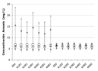 pH . Highly significant differences between medians corresponding to reactors 2, 3, 4, 5 and 6 with respect to the raw entrance or influent were found. Meanwhile, R1 showed no difference with respect to input. The average pH value recorded in the reactors was 5.1 and the minimum and maximum values were 4.3 and 7.0