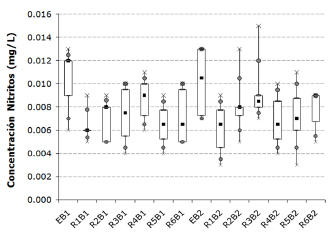 Nitrites. No significant differences (Table 3) were found. Figure 5 shows the values registered for this parameter during the study.