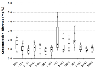 Statistically significant differences in nitrate removal were presented, with reactors R5 and R6 showing a better performance, with average efficiency exceeding 42%.