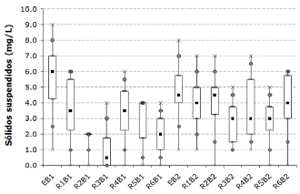 Suspended solids . There were significant SS removal differences between reactors (Table 3). The results obtained with the LSD test indicate that R1 and R4 reactors behaved similarly but differ from R3 (Figure 7). SS were efficiently removed, retained by the filters and due to MO decomposition due to microorganisms. Reactor R3 had the best performance with an average efficiency of 58.2%. Overall, removal efficiencies in the blocks ranged between 1.9 and 81.9% with average total removal of 37.5%. These values are within the ranges reported for both trickling filters (32) and submerged aerated biofilters (33).