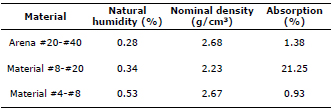 Materials were characterized according to procedures established by the Colombian Institute of Technical Standards ICONTEC and the Colombian Technical Standards -NTC- according to these tests: absorption and density of coarse (NTC 176) and fine (NTC 237) aggregates; sieved for fine and coarse aggregates (NTC 77); determination by washing the material in a 75μ sieve (NTC 78); determination by drying aggregate moisture (NTC 1776).