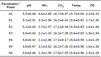 Daily measurement of water quality parameters . Table 2 presents the mean values as well as standard deviations calculated for pH, alkalinity (Alk.), CO2, temperature (Temp.) and OD, both in the constant level box that corresponded to the crude entrance or influent (CE) and each reactor’s output, where the letter R with the respective number refer to the reactor evaluated.
