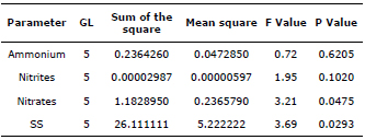 Water quality parameters measured 2 times per week. Table 3 shows variance analysis values corresponding to the effects of the reactors and their respective P value.