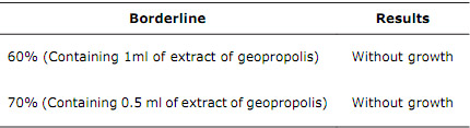 This result suggests that there is antimicrobial activity of geopropolis of Melípona quadrifasciata at concentrations above 60%.