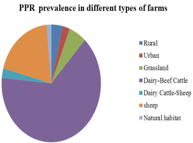 The prevalence of PPR in dairy- Beef cattle farms (25%) was higher than other farms. The high potential for cross-species transmission of PPRV from small ruminants to cattle in areas where these species live in close proximity suggests that monitoring such livestock communities would be useful for detecting any changes in the apparent pathogenicity of PPRV, including the possible emergence of PPR as a disease in cattle populations. The incidence of PPR in rural farms was higher (1.42%) than urban farms (0.92%). This variation may be due to poor management of traditional herders. The difference between the rate of disease in different livestock systems evaluated by chi-square analysis and there was a statistically significant difference (p<0.05).