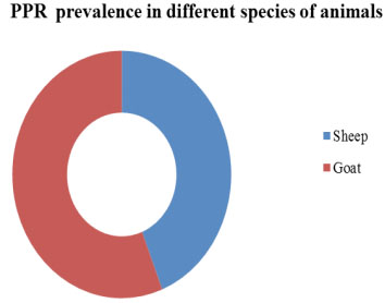 Distribution of disease in different types of herds is shown in figure 1. The prevalence of PPR in dairy- Beef cattle farms (25%) was higher than other farms. The PPR infection rate reported in goats was 1.69% and it was higher than sheep (1.32%). With chi-square test a statistically significant difference obtained between PPR prevalence in different types of animal farms (p<0.05) (Figures 1 and 2).