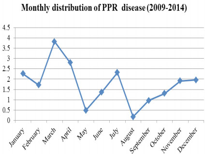 PPR prevalence from 2009 to 2014 was 2.1%, 2.59%, 0.7%, 0.49%, 1.08%, 1.73% respectively. Seasonal distribution of PPR infection was 2.6% in the spring, 1.55% in the summer, 0.32 per% in the autumn and 1.73% in the winter, respectively. The means of morbidity percentage in different months has been variable of almost 0.17% in August to 3.8% in March. The results of monthly distribution of the PPR have been shown in figure 3.