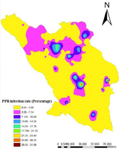 Out of 2231475 animals, 911145 were checked from 2009 to 2014. The results of this study showed that the overall prevalence of PPR was 1.37 % (12518). The spatial distribution of morbidity rates was 0.94% in Farsan, 0.64% in Kiar, 1.65% in Lordegan, 1.76% in Ardal, 1.375% in Ben, 0.95% in Shahrekord, 1.03% in Borujen and 2.42% in Kouhrang cities. However, with spatial modeling, the main hotspot of PPR was observed in Borujen (morbidity rate: 1.03%), However, two other hotspot were found in Ardal and Naghan (morbidity rates: 1.76% and 4.3% respectively). With chi-square test there wasn’t a statistically significant difference between morbidity rates in different cities (p<0.05)