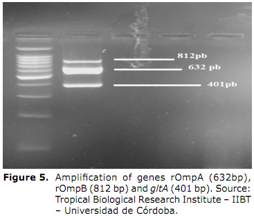 Molecular techniques, such as the various methodologies of PCR and sequencing, allow for a quick and specific diagnosis by detecting rickettsia DNA in infected tissues, cultures, and ticks. The genes usually analyzed are those that code two external membrane proteins: rOmpA, rOmpB (7,36). The gltA gene is also used (Figure 5), which encode the citrate synthetase enzyme, present in all Rickettsias, the gene that codes the 17-kDa protein present in all SFG rickettsias, and gene D, found in most species. PCR should be the ideal diagnostic test; however it has some drawbacks such as the low sensitivity when the sample comes from animals that do not display highly rickettsemia, and the impossibility of obtaining isolation(8,37,38).