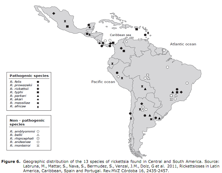 Epidemiology, prevention, and control. Although rickettsias have a worldwide distribution, at least 13 species have been found in Central and South America, and most of the species classified as in the SFG (Figure 6) (40)