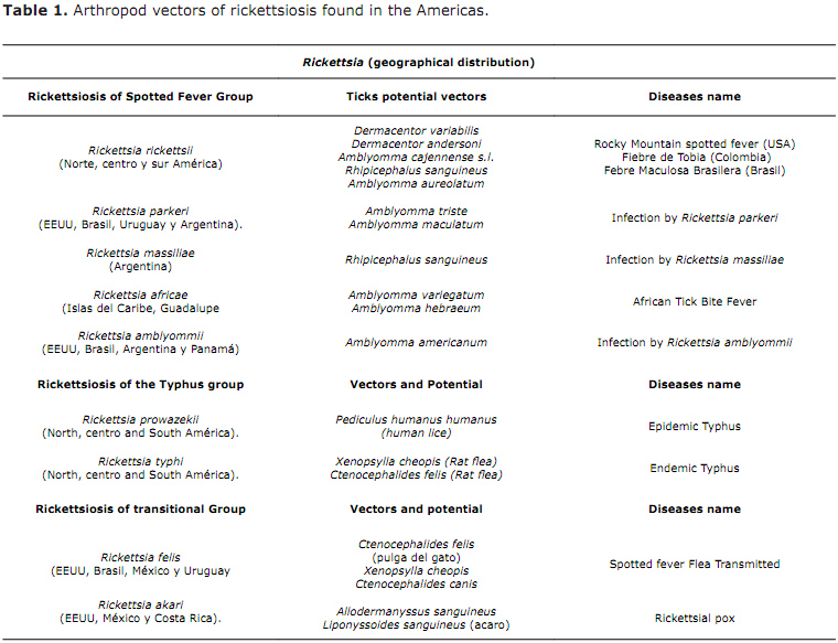 Competent vectors of rickettsiosis transmission. Several arthropods are efficient rickettsia vectors, reservoirs, or amplifiers, and their distribution and ecology affect the epidemiology of rickettsiosis. RMSF (Rocky Mountain Spotted Fever) cases in the United States (transmitted by Dermacentor variabilis and D. andersoni), as well as the Mediterranean Boutonneuse fever (transmitted by Rhipicephalus sanguineus) are more prevalent in late spring and summer, since these ticks are more active during these seasons (7). In contrast, tick activity in Colombia is constant and increases during the dry season between December and February. The most known vectors are summarized in table 1.