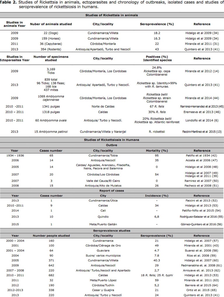 Studies in humans. In Colombia, the first cases of the Tobia fever, as the Rocky Mountain spotted fever caused by Rickettsia rickettsii is known, were reported in 1934 and 1936 in the municipality of Tobia, in Cundinamarca, Colombia (42). During a period of 65 years, the disease was unseen by health entities, and only until 2001 a study of seroprevalence of Rickettsia sp. in fieldworkers of the rural area of the municipality of Ciénaga de Oro (Córdoba, Colombia) a high and concerning 49% prevalence was found in the analyzed subjects. The high seroprevalence found in the area demonstrated the circulation of our rickettsia of the spotted fever group (43). Consequently, more studies were made in the country and isolated cases and outbreaks of the disease appeared in various parts of the country, summarized in table 2.