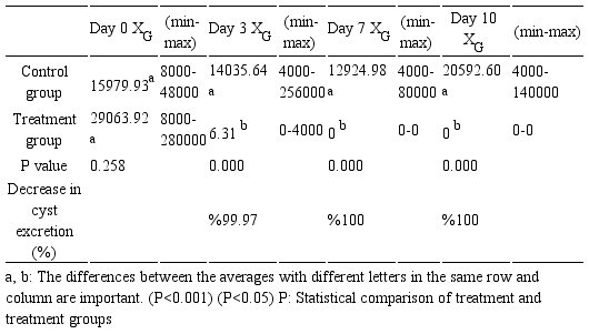 Assessment of treatment efficacy. Secnidazol treatment efficacy in calves involved in this research was assessed by microscopic examination of fecal samples collected on D0 and D10, for prevention of bias that would interfere due to probable reinfection, and measured based on the reduction in cyst output in 2 gropus of calves. Calculation of the reduction in cyst excretion was performed by use of the Henderson–Tilton formula, composed of geometric mean cyst counts similar to those of described previously by Geurden et al (21) and adapted by previous studies (22,23,24).