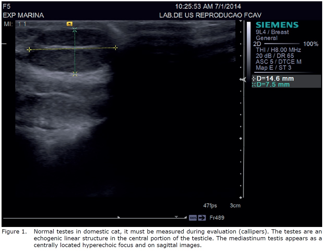 The B-mode ultrasonography in testicular animals allows the determination of biometric values such as volume and size, assessment of topographic and parenchymal features, position and its internal constitution (4). In cats, the testes are readily located within the scrotum and they have easily located by ultrasound (1).
