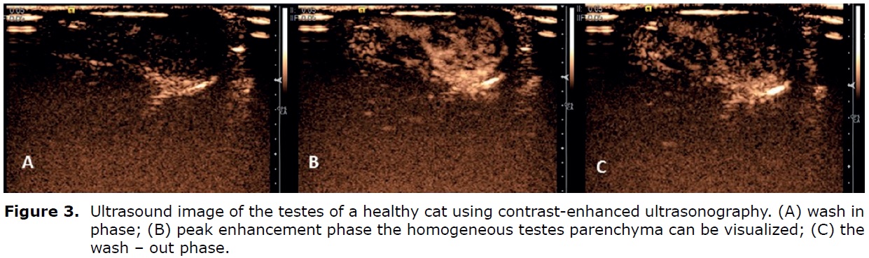In veterinary medicine, are few studies has been used to evaluate pancreas and lymph nodes (31), spleen (32-33), liver (34-35), kidneys (36), prostate (37). In testes, the first study on the use of the technique was performed in dogs (27). However, contrast-enhanced ultrasonography of the testicles of cats revealed mean wash-in time in healthy cats to be 8.78s and peak enhancement time 21.62s and wash-out time 75.36s. Contrast-enhanced ultrasonography of the left testicles revealed mean wash-in time 10.76s and peak enhancement time 21.50s and wash-out time 81.81s and of the right testis revealed (Figure 3). Furthermore, contrast fill the subcapsular vascular structures and after a few seconds, a homogeneous moderate enhancement of the parenchyma, with parenchymal vessels still distinguishable and after the peak phase, a rapid homogeneous decrease in echogenicity (7).