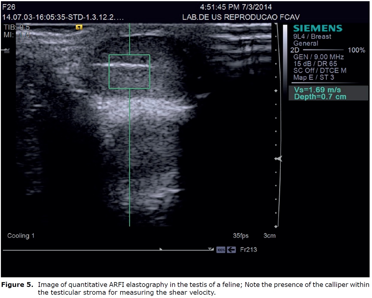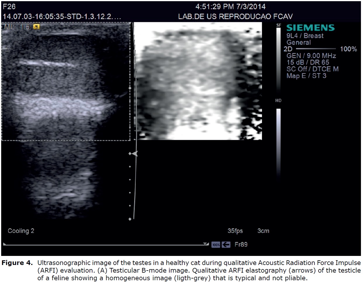 Quantitative and qualitative ARFI elastography of the testes in cats is easily performed. Furthermore, the reference values for testicular elastography in healthy cats, the differences in shear velocity values of diseased tissues can be evaluated to differentiate between benign and malignant tumours in felines, once the definitive diagnosis of benign or malignant lesions is made only by histopathology after castration, considered a invasive method, which promotes the loss of the reproductive value of animals (44).