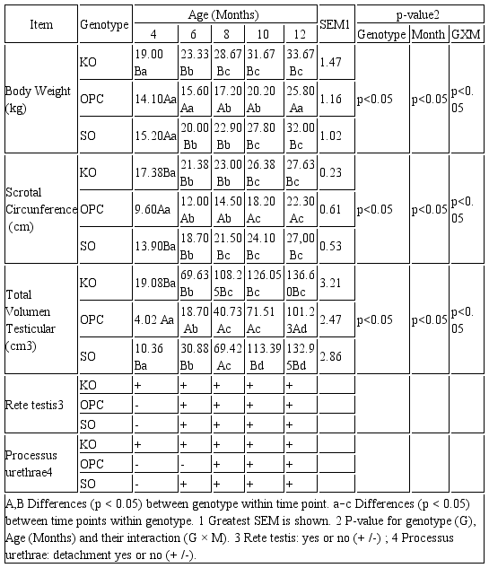 In this study, significant differences were observed between genetic groups (Table 1), with lower values for OPC on scrotal circumference and testicular volume (p<0.05).