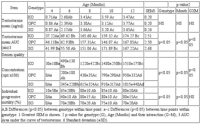 Statistical analysis. Data for semen characteristics, testosterone concentration (AUC, mean), and body and testicular measurements were analysed for the effect of age (time), genotype and genotype-time interaction, using repeated measures analysis of variance in the GLM procedure. Duncan’s test was used to compare means. Data are presented as means and SEM. The level of significance was set at p<0.05 for all tests. Data was analysed using SAS System (SAS version 9.12, SAS Institute Inc.).