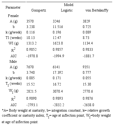 The highest values of A in both sexes when the von Bertalanffy model was used, agree with the results reported previously in commercial turkey (2). In addition, in turkeys, Segul and Kiraz (10) found a low A value with the Logistic model in comparison with the Gompertz model. These results indicate that different models predict different mature body weights in turkeys; thus, the importance of choosing the best model.