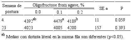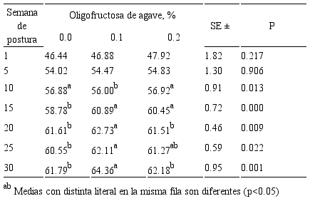 Postura y peso del huevo. Los grupos adicionados con dos niveles de OFA, mostraron un incremento en el porcentaje de postura, así como el peso del huevo con respecto al grupo testigo. Estos resultados concuerdan con los informes de Chen et al (19), quien determinó que la adición de oligofructosa al 1,0% e inulina al 1.0% a las dietas durante 4 semanas aumentaron (p<0.05) la producción de huevo en un 13.35% y 10.30%, respectivamente en comparación con el grupo de control. Asimismo, Chen et al (19) observaron un aumento en el peso del huevo acumulado después de la adición de oligofructosa (1ª semana, 7.93; en general, 12.50%). En estudios realizados en Corea se encontraron diferencias al comparar el porcentaje de postura de grupos adicionados con distintos niveles de inclusión de inulina, siendo mejores aquellos grupos con mayor cantidad de inclusión (8). Otros estudios han demostrado que al adicionar oligosacáridos a la alimentación de gallinas ponedoras, se incrementa el peso de huevo (14).