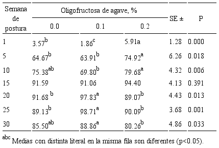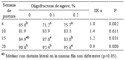 En el porcentaje de postura (Tabla 2), el grupo testigo y grupo con OFA al 0.2% se comportaron de manera similar, sus valores fueron estadísticamente superiores con respecto al grupo adicionado con OFA al 0.1% a partir de la semana 20 de postura.