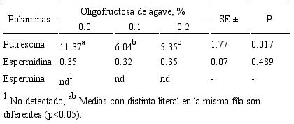 Con respecto a los valores de poliaminas (Tabla 6), los estudios arrojaron que para el caso de putrescina los grupos adicionados con los oligofructanos presentaron valores inferiores al testigo (p<0.05). Los valores de espermidina fueron similares para el grupo testigo y el grupo adicionado con 0.2% de OFA, mientras que la espermina no fue detectada eb ninguna de las muestras.