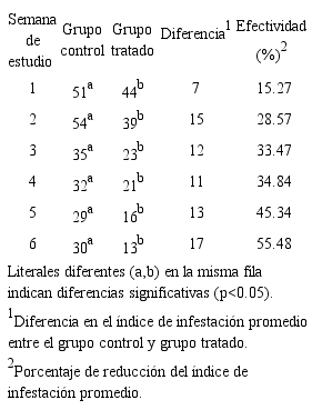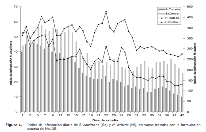 Análisis estadístico. Los datos generados durante el período de estudio fueron analizados mediante ANOVA y la prueba t de Student (p<0.05), con el objetivo de demostrar las diferencias entre los grupos en cada semana de estudio utilizando el índice promedio de infestación de la semana correspondiente; estos cálculos se desarrollaron paraH. irritans y S. calcitrans de manera independiente. Se utilizó la fórmula de Abbott para determinar la eficacia de la formulación de Ma135, identificando el porcentaje de reducción en el índice de infestación promedio para cada semana evaluada (14,15,16).
