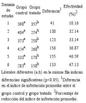 La formulación acuosa de Ma135, fue eficiente para controlar la infestación natural por S. calcitrans en el ganado bajo estudio en un 69%, reduciendo el índice de infestación semanal de 44 a 13 en las seis semanas de duración de la prueba. El índice de infestación semanal fue estadísticamente diferente entre los grupos (p<0.05) en cada una de las seis semanas de estudio; la eficacia del formulado fue más importante conforme se sucedieron las aplicaciones, siendo mayor conforme se acumularon más aplicaciones (Tabla 2). La eficacia de la formulación en el ganado tratado se observó desde la primera semana posterior a su aplicación y mantuvo la tendencia de reducción del índice de infestación durante todo el estudio, mientras que el grupo control tuvo un índice de infestación siempre mayor al del grupo tratado (Figura 1). La población de S. calcitrans el día previo a la aplicación del tratamiento se estimó con un índice de infestación de 46 moscas/animal en el grupo tratado y de 44 en el grupo control; el último día de la prueba el grupo control tuvo un índice de infestación de 26 y el tratado de 10.