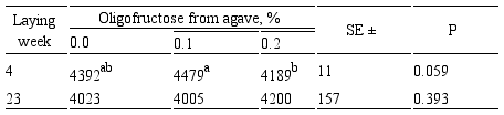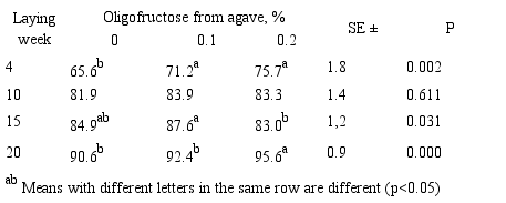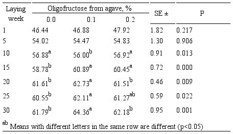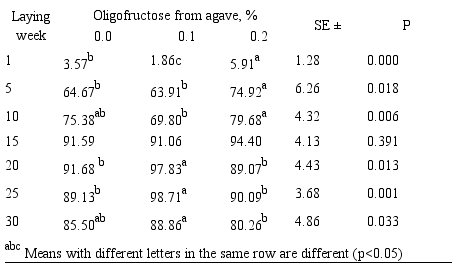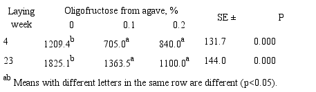 Abstract: Objective. To determine egg production in laying hens treated with oligofructose from agave. Materials and methods. Eighteen weeks old Hy-line W-36 hens (n=300) were distributed randomly into 3 treatment groups: no feed supplementation (control) or feed supplementation with 0.1% of 0.2% oligofructose from agave (OFA). Hens were monitored from development until 30 weeks of egg laying. Results. A significant (p<0.05) increase in the percent of egg-laying hens as well as increased in egg weight and egg quality occurred in hens from the OFA treatment groups relative to the control hens. Significantly lower levels (p<0.05) of fecal putrescine were observed in hens from the OFA treatment groups. Conclusions. The oligofructose from agave may be used as an alternative feed additive in laying hens.