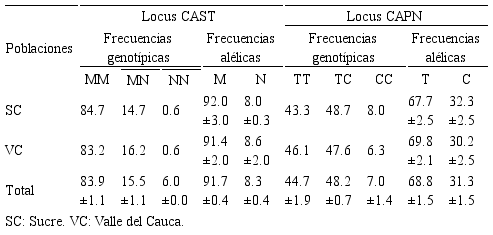 Para el locus CAPN se encontró mayor frecuencia del genotipo heterocigoto, en toda la población (48.2±0.7%) como en las subpoblaciones SC (48.7%) y VC (47.6%). El genotipo CC presentó la menor frecuencia (Tabla 1). El alelo T del locus CAPN alcanzó una frecuencia de 68.8 ± 1.5% para toda la población, siendo más alta en la subpoblación VC, de otro lado, el alelo C presentó mayor frecuencia en la subpoblación SC (Tabla 1).