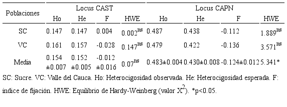 En la tabla 2 se pueden apreciar los valores de diversidad genética en la población de OPC estudiada. En el locus CAST, los valores de Ho y He promedios fueron similares con un ligero exceso de heterocigotos no significativo; de otro lado, en el locus CAPN este exceso indujo a un valor negativo de F y desvios significativos del EHW (p<0.05). Los valores de Ho y He para el locus CAST fueron más altos en la subpoblación VC y en el locus CAPN en la subpoblación SC. Solo el valor de F fue positivo en la subpoblacion SC para el locus CAST (0.004) los demás valores fueron negativos. El análisis locus a locus indicó que todos se encontraban en EHW.
