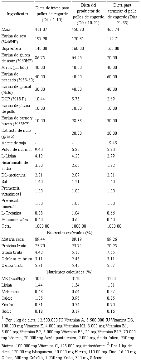 En la tabla 1 se presentan los ingredientes y los resultados de los análisis de nutrientes de los piensos utilizados en el ensayo. Los pollos de engorde fueron alimentados con alimento inicial durante los días 1 a 10, seguidos por alimento de los productores durante los días 10 a 21, y alimento de los acabadores durante los días 21 a 35. Se formuló una dieta basal de harina de maíz y soja de acuerdo con la NRC (1994). Los pollos de engorde recibieron alimento en pellets durante todo el período. Los alimentos y el agua se ofrecieron libremente a todos los grupos. El ensayo duró 35 días. Se aplicó un programa de iluminación de 24 horas durante todo el ensayo.