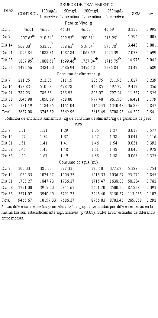 Murali et al (4) y Corduk et al (11) informaron que la suplementación con L-carnitina en las raciones de pollos de engorde no tuvo un efecto significativo en el consumo de alimento. Los resultados de estos investigadores están acordes con nuestros hallazgos que indican que la adición de diferentes niveles de L-carnitina en el agua potable no afecta significativamente el consumo de alimento de los pollos de engorde. Por otro lado, también hay estudios que demuestran que el suplemento de L-carnitina afecta significativamente el consumo de alimento. Wang et al (15) informaron que el suplemento de L-carnitina (100 mg/kg) redujo significativamente el consumo de alimento en pollos de engorde criados a bajas temperaturas ambientales. Tales diferencias entre los resultados de las investigaciones pueden atribuirse a los niveles de dosis del suplemento de L-carnitina utilizado, los niveles de energía de la ración y las especies animales utilizadas. El hecho de que no haya diferencias estadísticas entre los grupos referidos a partir de los valores de ingesta de alimento obtenidos al final del estudio indica que los niveles de dosis de L-carnitina utilizados no tienen un efecto significativo sobre el apetito en los pollos de engorde.