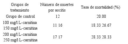 Tasas de mortalidad. Los efectos de la administración de suplementos de L-carnitina en las tasas de mortalidad de los pollos de engorde se presentan en la tabla 3. La tasa de mortalidad más baja (18.33%) se registró en el grupo suplementado con 100 mg/l de L-carnitina, mientras que la tasa de mortalidad más alta (28.33%) se registró en los grupos suplementados con 200 y 250 mg/l de L-carnitina.