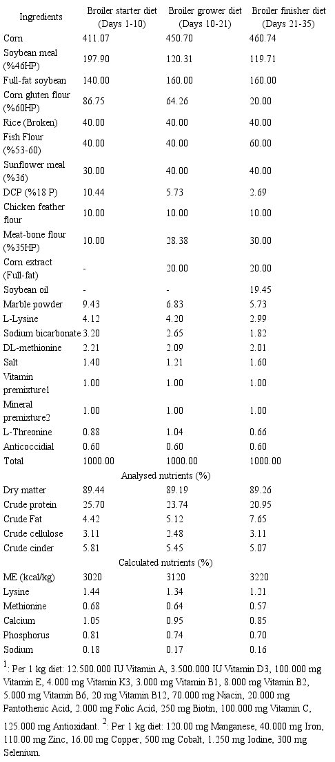 Ingredients and nutrient analysis results of the feeds used in the trial are given in table 1. Broiler chicks were fed with starter feed for days 1-10, followed by grower feed for days 10-21, and finisher feed for days 21-35. A corn-soybean meal basal diet was formulated according to NRC (1994). The broilers received pellet feeds throughout the whole period. Feed and water were given freely to all groups. The trial lasted 35 days. A 24-hour lighting program was applied throughout the trial.