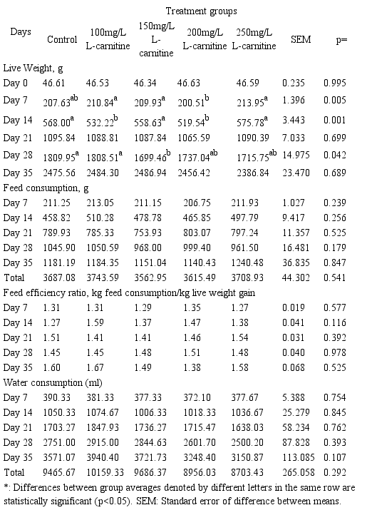 As indicated by table 2, no significant differences were recorded in water consumption values between groups throughout the trial (p>0.05). On the other hand, though not statistically significant, total water intake was higher in the group supplemented with 100 mg/ l L-carnitine compared to the other groups by the end of the trial.