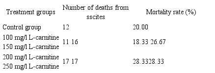 Mortality rates. The effects of L-carnitine supplementation on mortality rates of broilers are presented in table 3. The lowest mortality rate (18.33%) was recorded in the group supplemented with 100 mg/l L-carnitine while the highest mortality rate (28.33%) was recorded in the groups supplemented with 200 and 250 mg/l L-carnitine.
