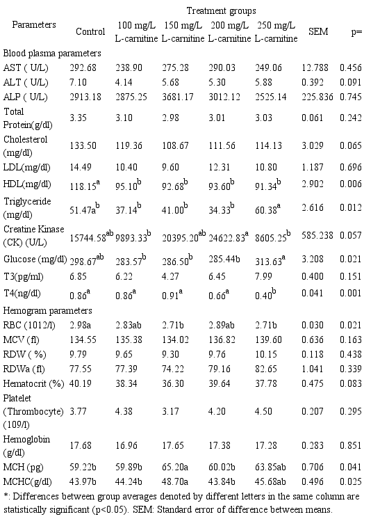 Blood plasma and hemogram parameters. The effects of L-carnitine supplementation in water on selected blood plasma and hemogram parameters are shown in table 4. By the end of the trial, L-carnitine supplementation did not result in any significant differences between groups in blood plasma parameters Aspartate aminotransferase (AST), Alanine aminotransferase (ALT), Alkaline phosphatase (ALP), total protein, cholesterol, Low density lipoproteins (LDL), Triiodothyronine (T3) concentration and hemogram parameters Mean corpuscular volume (MCV), Red cell distribution width (RDW), Red cell distribution with actually (RDWa), hematocrit, platelet, hemoglobin concentrations (p>0.05). On the other hand, significant differences were recorded in High density lipoproteins (HDL), triglyceride, creatine kinase, glucose, Thyroxine (T4), Red blood cell count (RBC), Mean corpuscular hemoglobin (MCH) and Mean corpuscular hemoglobin concentration (MCHc) values between groups (p<0.05).