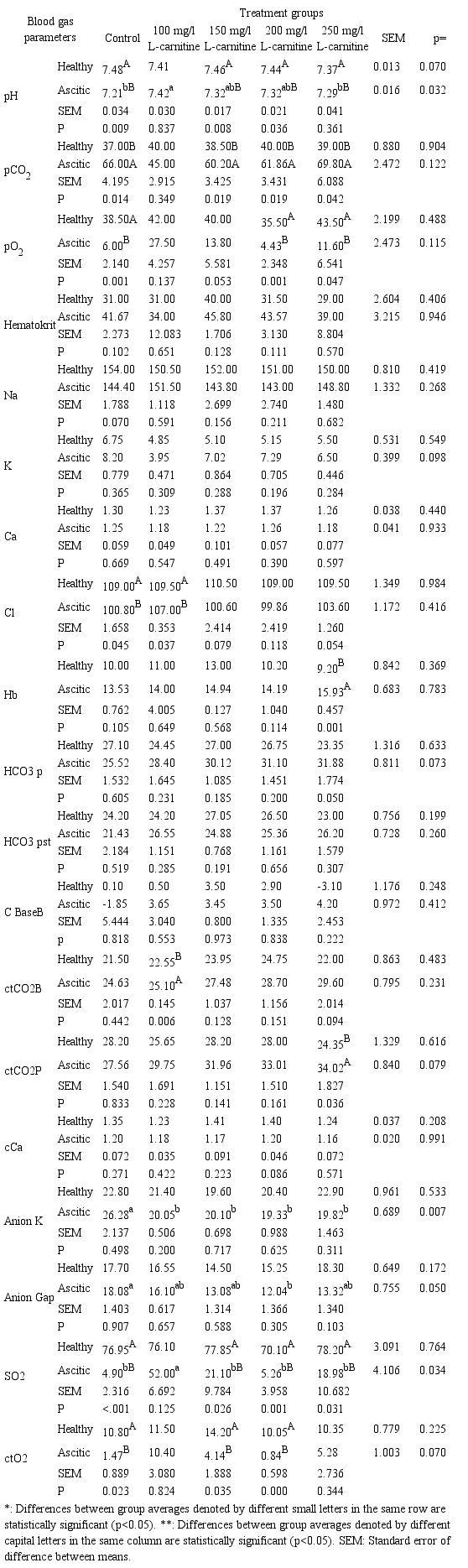 Blood gas parameters. Blood gas, oximetry, electrolyte and metabolite were measured in the blood samples taken from 3 ascitic broilers and 3 healthy broilers from each subgroup. The effects of L-carnitine supplementation on blood gas paramaters of ascitic and healthy broilers are presented in table 5. L-carnitine supplementation in water did not have any significant effects on hematocrit, Sodium (Na), Potassium (K), Calcium (Ca), Plasma bicarbonate (HCO3 p), Standart bicarbonate (HCO3 pst), Base excess (C Base B) blood gas, electrolyte and metabolite values of ascitic and healthy broilers (p>0.05). On the other hand, Pouvoir hydrogen (pH), Partial pressure of carbon dioxide (pCO2), Partial pressure of oxygen (pO2), Chlorine (Cl), Hemoglobin (Hb), Breathe carbon dioxide concentration (ctCO2B), Partial pressure of carbon dioxide concentration (ctCO2P), Anion K, Anion Gap, Oxygen saturation (SO2) and Oxygen content (ctO2) values were significantly affected by treatments (p<0.05). Blood pH value significantly decreased in ascitic broilers compared to healthy broilers.
