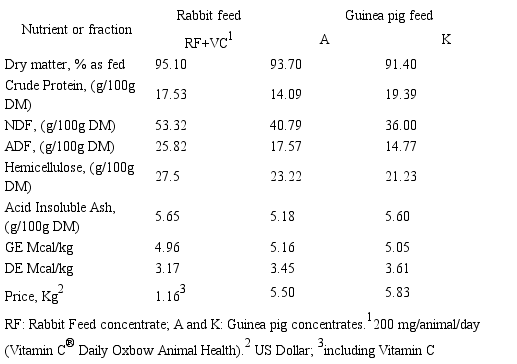Considering that rabbits do not require large amounts of vitamin C, it is possible that commercial foods for these lagomorphs contain less than 200 mg/kg of vitamin C in the feed, which is the concentration required for guinea pig (5). Therefore, an experiment was carried out to evaluate the digestibility, growth and yield of guinea pigs fed two foods specially formulated for this species and a commercial food for growing rabbits with vitamin C supplementation.