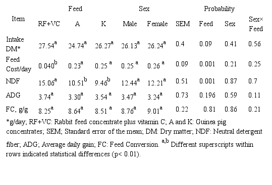 Feed intake, the cost of feeding, the increase in body weight and the feed conversion are presented in table 2; the main effects are presented because there was no interaction (type of feeding × sex). There were no differences (p> 0.05) in DM intake between treatments, but the intake of NDF was higher (p≤0.01) in animals that consumed food formulated for rabbits, because rabbit food contained higher amounts of NDF than food designed for guinea pigs (Table 1). As a result of a similar intake of dry matter and due to the lower price of RF+ VC, the animals fed with rabbit feed had a lower expense for feeding (Table 2).