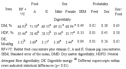 Abstract: Objetive. An experiment was conducted to evaluate the feed intake, digestibility and growth of pigs fed with two feeds (A and K) specially formulated for this species and a commercial feed for growing rabbits with supplementation of vitamin C (RF+VC). Materials and methods. Eighteen Guinea pigs of 248±38 g initial body weight were distributed in a completely randomized design with factorial arrangement 3×2 (dietary treatments and sex). Feed and neutral detergent fiber intake, weight gain, feed/gain, and morphometric variables were measured individually for 30 days. Dry matter and neutral detergent fiber digestibility were measured during the last seven days of the experiment. Results. There were no differences on feed intake (p=0.88); however, the dry matter digestibility was higher (p<0.01) in feeds formulated for Guinea pigs (A and K) and lower in the rabbit feed plus vitamin C. The intake and digestibility of NDF were higher in the RF+VC and lower in feeds for Guinea pigs (p< 0.01). The average daily gain was similar among the treatments (p>0.05). There were no differences (p>0.01) in the morphometric variables among dietary treatments, but there were sex differences as the males were bigger than the females (p<0.01). Conclusions. The results indicate that Guinea pigs can be fed with rabbit feed supplemented with vitamin C.