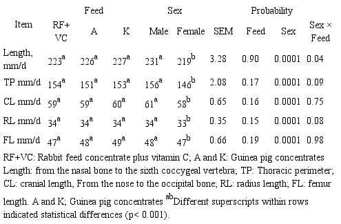 Daily body weight gain, feed conversion and morphometric variables. During a period of 30 days, the guinea pigs were weighed every seven days to determine the average daily gain. The feed conversion (A: G) was calculated for the total of the experiment. The morphometric measurements evaluated included: body length (nasal bone to the sixth coccygeal vertebra), the circumference of the thorax, cranial length, length of the femur and length of the radius. All morphometric variables were recorded at the beginning and end of the experiment.